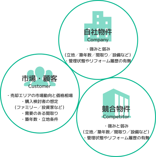 私たちは、3C分析(自社・顧客・競合)や不動産鑑定の視点を組み合わせたロジカルな査定を行い、